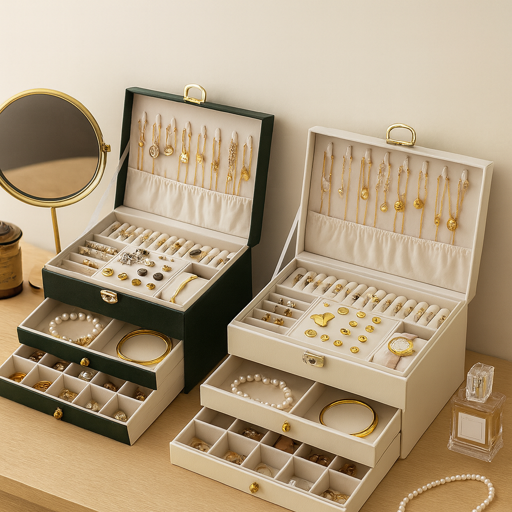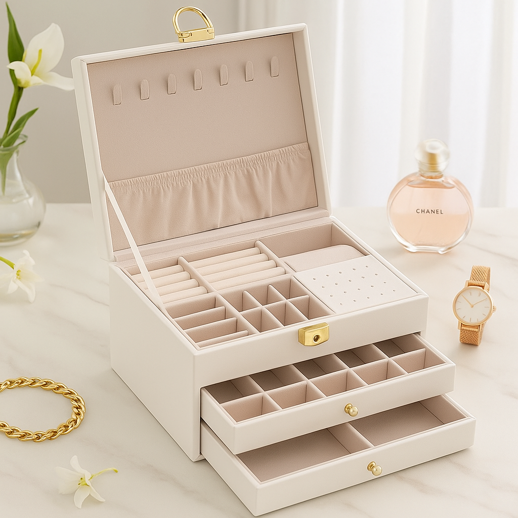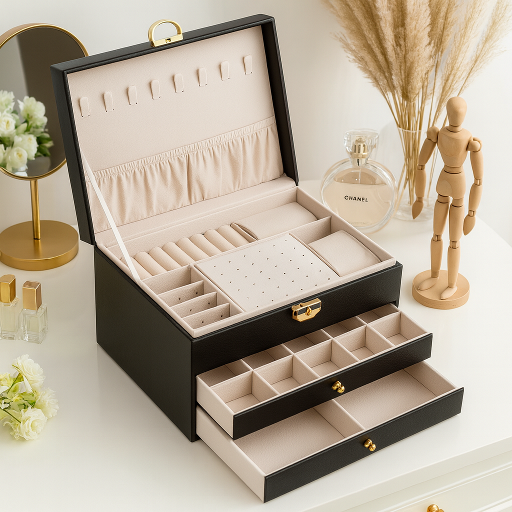 ✨ Transformez votre rituel de beauté en un moment de luxe et de sérénité grâce à cette boîte à bijoux élégante et intemporelle.